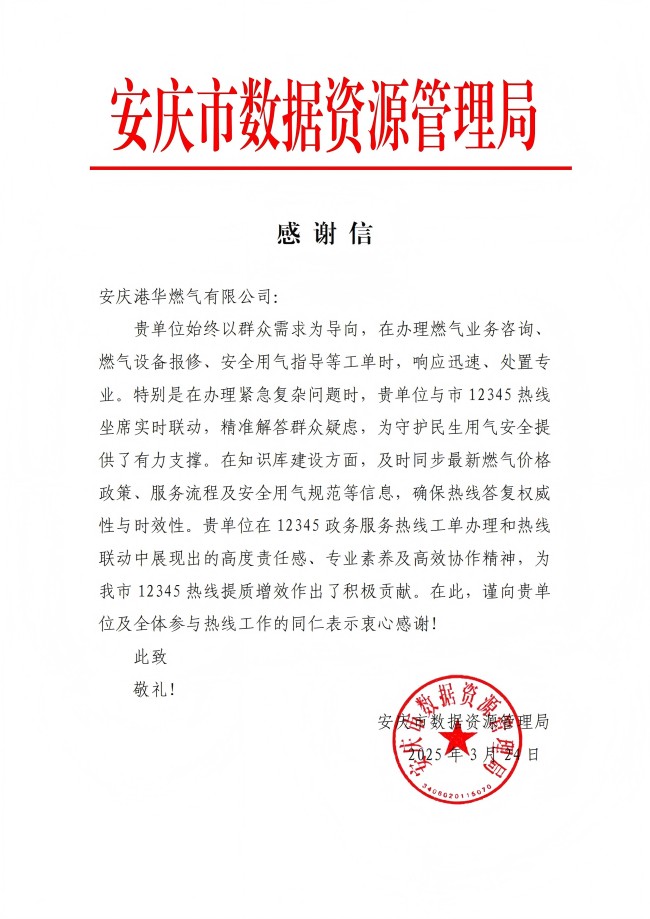 3月24日,安慶市數(shù)據資源管理局向安慶港華發(fā)來感謝信,對我司2024年燃氣熱線問題辦理的工作成效給予充分肯定。